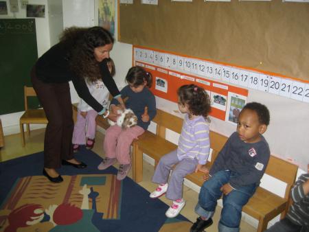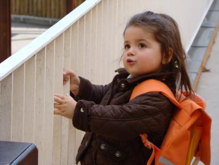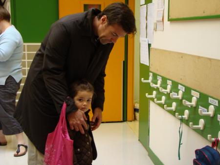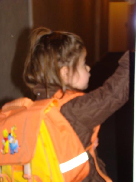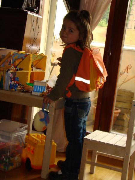 Ce matin, le réveil a sonné à 7h30 dans la chambre de notre petite Mathéa... réveil acheté pour l'occasion, svp !!!... et c'est avec un grand sourire qu'elle est descendue de son lit, pour s'habiller et se préparer pour sa première rentrée. Tout le monde était sur le pied de guerre, mamie aussi, Léana a préférer faire une grasse matinée. C'est avec une grande fierté que "Daddy" l'a accompagnée. Très vite, la maitresse a jugé que Mathéa se moquait de la présence de son papa, puisqu'elle était "accrochée" à la cage du lapin "Caramel". La maitresse s'appelle Inés, c'est la directrice... Tout s'est très bien passé !!!