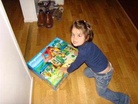 La journée a été placée sous le signe de la fête !!! Tout a commencé à l'école, avec 2 gâteaux au chocolat avec 3 bougies et des jus de fruits ; ensuite, Alida avait acheté des Kinder pour le goûter des enfants en l'honneur de MAthéa et enfin, un petit "apéro" surprise avec chips & Co (ce que Mathéa adore) et surtout les cadeaux. Mamie et Claude ont envoyé un colis plein de surprises, Léana a offert un livre et un dvd et nous, les parents, avons acheté la ferme des Playmobil, un vrai casse tête à monter !!! Pour l'occas, Léana avait troqué son pyjama pour une jolie tenue...